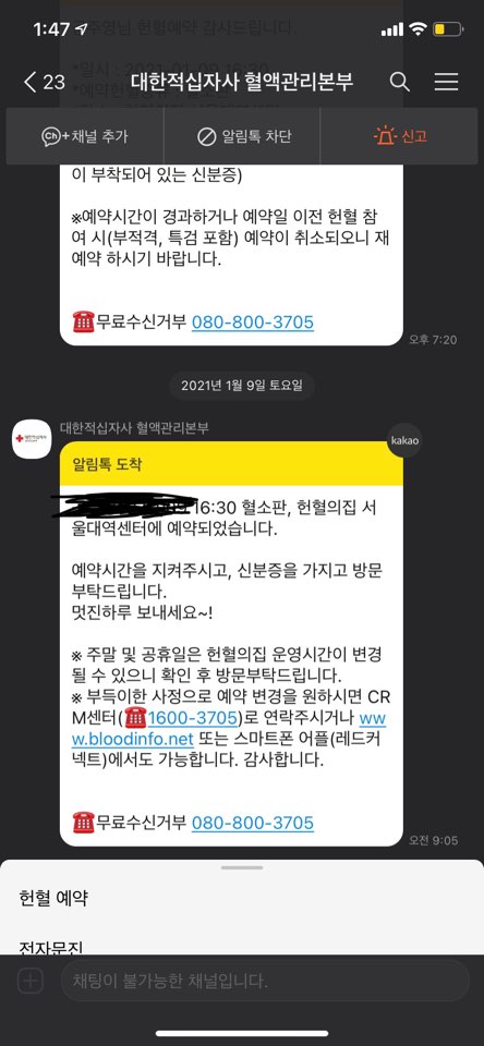 어쨌든 저렇게 예약을 마치고 나면 카카오톡으로 예약 알림이 온다.