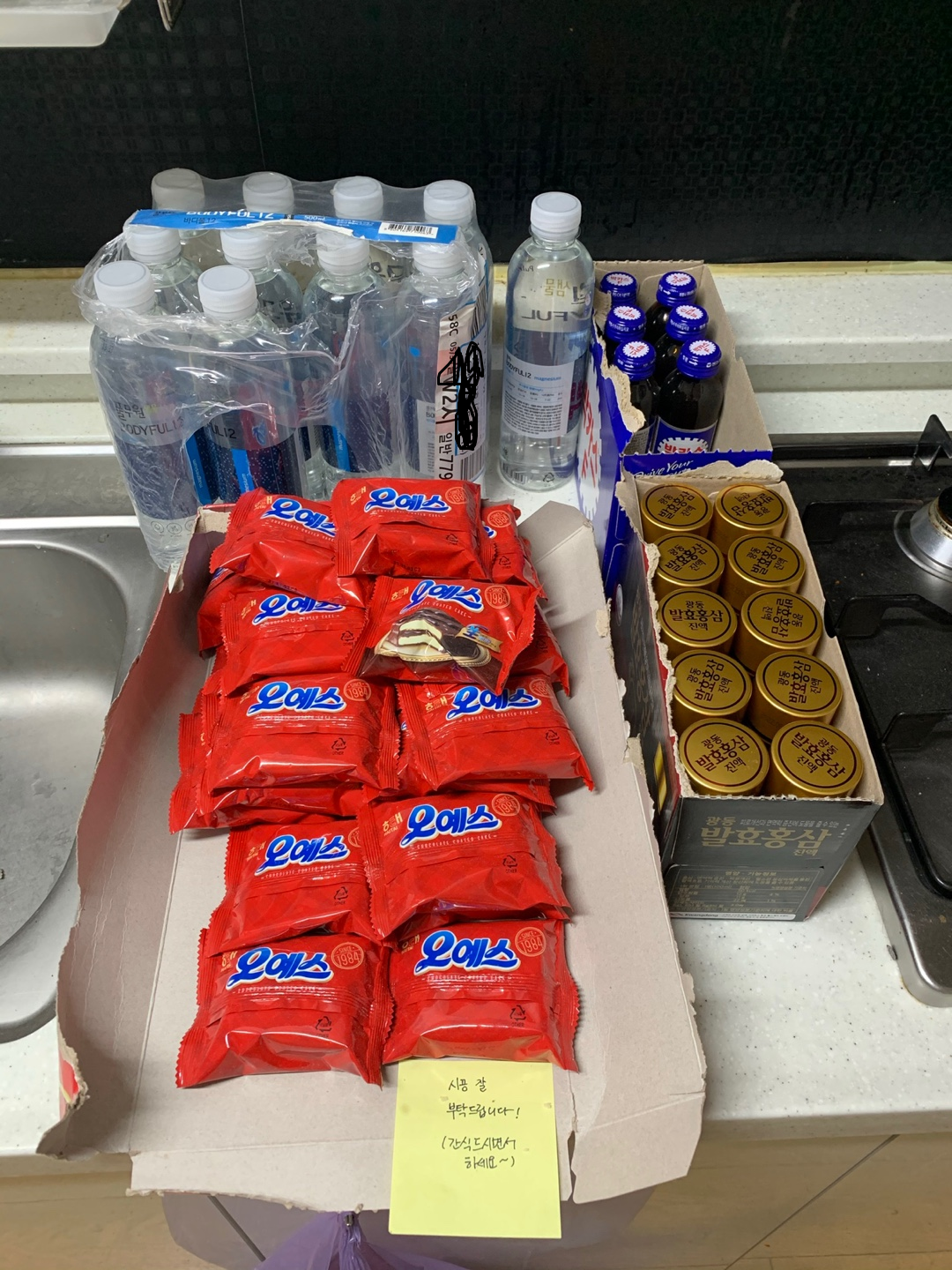 (간식 놔둬도 하자 낼 사람은 낸다고 듣긴 했지만.. 그래도 그냥 사람 맘이 가져다 놓게 되더라.. 더더욱 우린 직장인이라 낮시간에 시공 장소에 와서 확인을 할 수가 없어서... 그저 잘 해주시기를 빌 뿐이었다. 엄마 말로는 홍삼 한뿌리, 이런 몸보신 드링크가 인기있다고 해서 나중에는 저렇게 홍삼 드링크도 넣어놨다. 냉장고도 없는 공실인 집이라 시원한 물을 드리기도 어려움...)