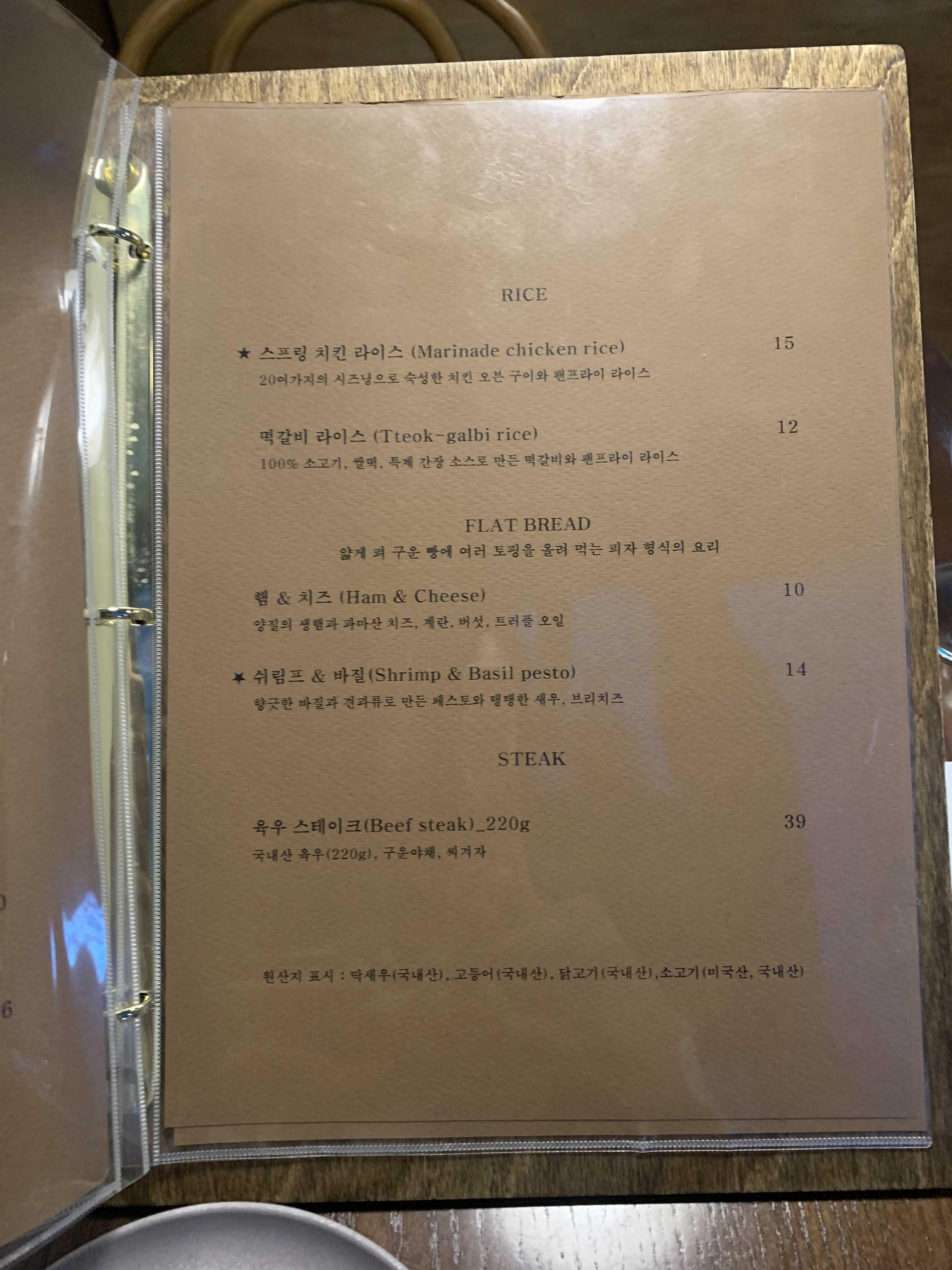 스테이크와 플랫브래드 쉬림프 앤 바질 시켰다.